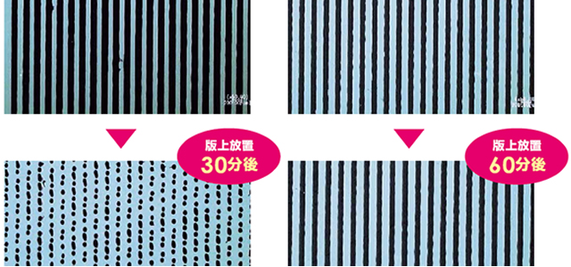 版上にインキを被せ 1時間放置しても再印刷が可能です。印刷作業の中断時の手間の削減など作業性が大幅に向上します。